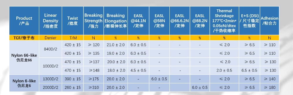 高适配断裂强度、高断裂伸长、低干热缩短、高模量、险些不吸湿